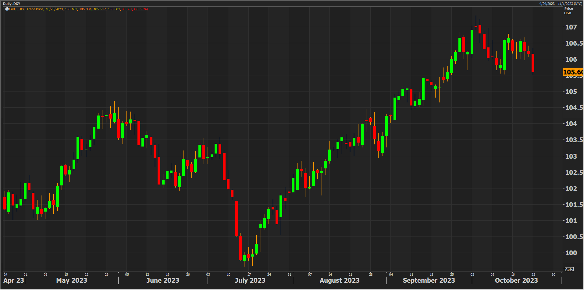 انخفض الدولار مقابل سلة من العملات اليوم الاثنين، متتبعاً تراجع عوائد سندات الخزانة الأميركية من مستوى 5% الذي بلغه في وقت سابق من الجلسة، ومع انتظار المتداولين بيانات اقتصادية أميركية جديدة من المقرر أن تصدر في وقت لاحق هذا الأسبوع.