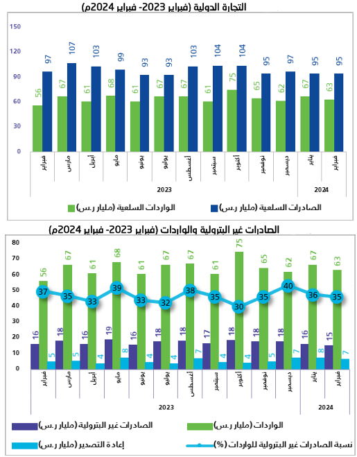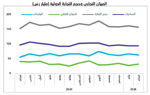 وارتفعت الواردات خلال فبراير بنسبة 12.3% فيما انخفضت الصادرات السلعية البترولية بنسبة 3.8% مقارنة بالشهر ذاته من العام الماضي مع تراجع إنتاج المملكة من النفط بعد تطبيقها للخض الطوعي منذ منتصف العام الماضي.