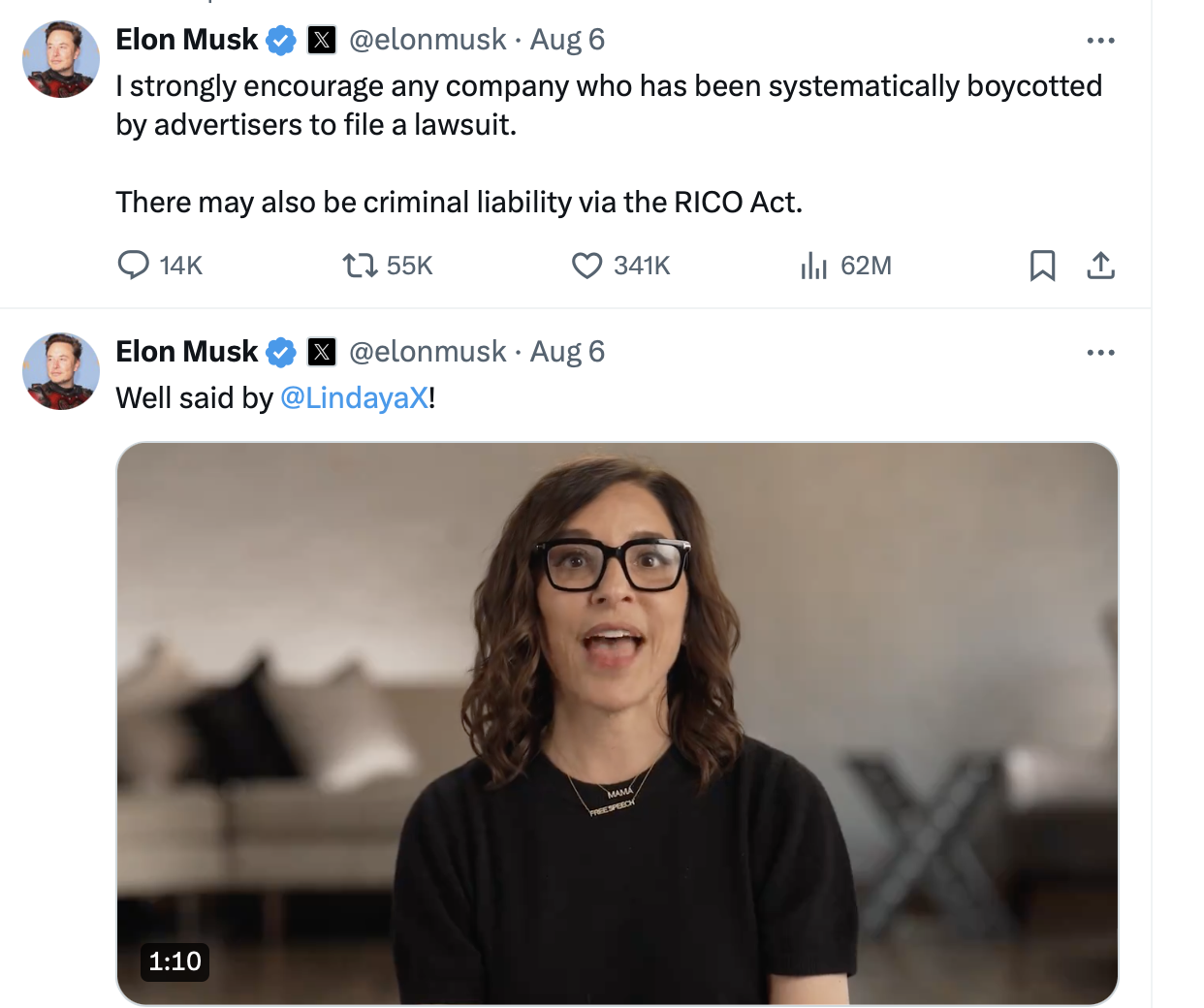 وفي بيان لها بشأن الدعوى القضائية، قالت ليندا ياكارينو الرئيسة التنفيذية لشركة إكس "يتضرر الكثيرون عند تضييق سوق الأفكار، لا ينبغي أن تحتكر مجموعة محدودة من البشر ما يحقق الإيرادات".