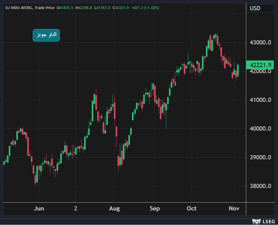ارتفع مؤشر الداو جونز بنسبة 1% أي ما يعادل 427 نقطة في جلسة الثلاثاء مسجلاً أعلى مكاسب يومية في نحو شهر.