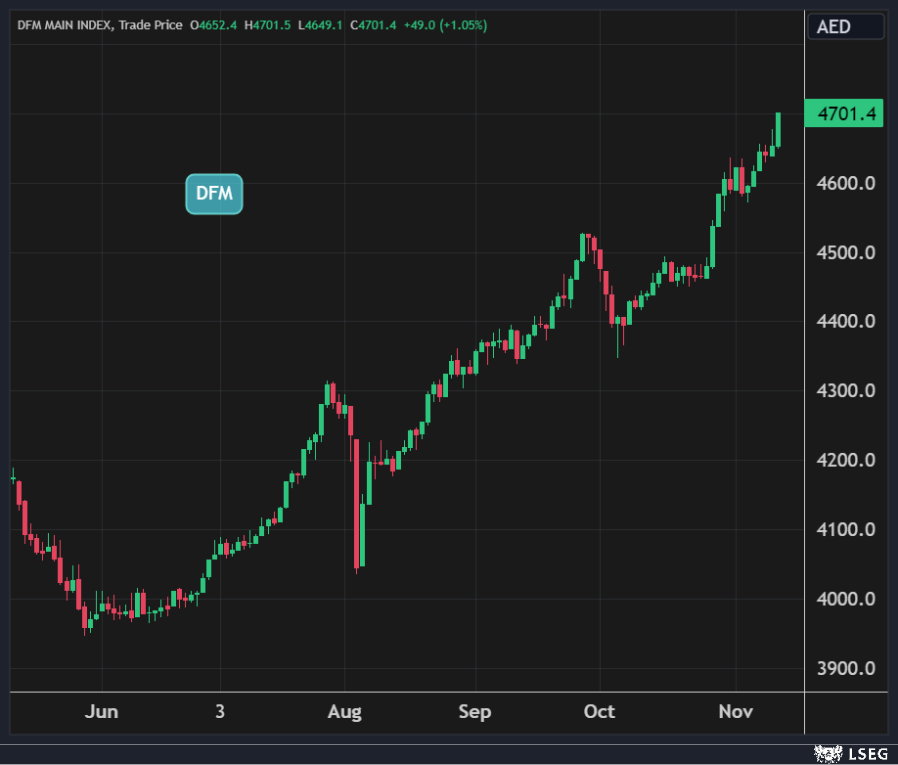 بالمقابل، قفز مؤشر سوق دبي بأكثر من 1% ليغلق فوق مستويات 4700 نقطة لأول مرة في 10 سنوات بدعم من ارتفاع سهمي إعمار العقارية وإعمار للتطوير بنسبة 1.5% و10% على التوالي.