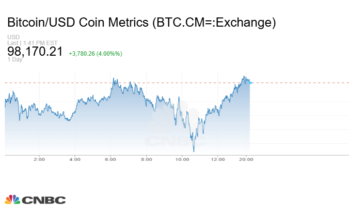 وعادت العملة المشفرة الأكبر من حيث القيمة السوقية إلى مستويات فوق 98 ألف دولار في أحدث تعاملات يوم الخميس 21 نوفمبر/ تشرين الثاني، وذلك بعد تجاوز هذا المستوى للمرة الأولى على الإطلاق في وقت سابق من اليوم قبل أن تقلص مكاسبها إلى أقل من 97 ألف دولار.