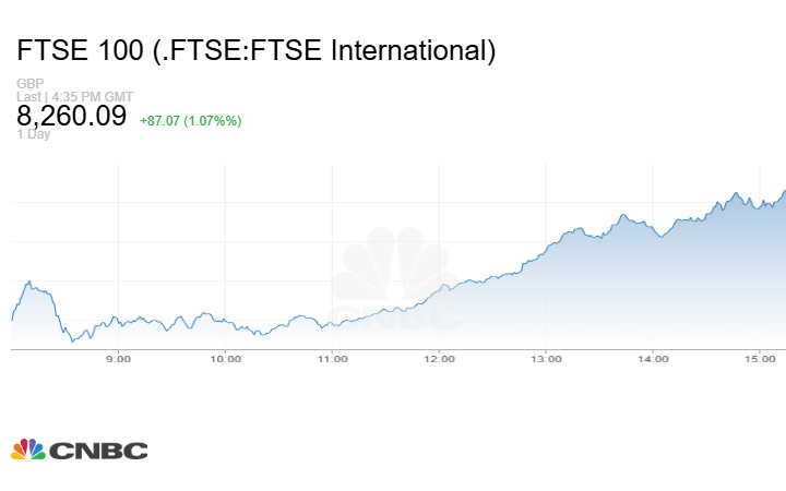 وصعد مؤشر FTSE 100 البريطاني 87.07 نقطة أو بنسبة 1.07% عند الإغلاق إلى مستوى 8260.09 نقطة.