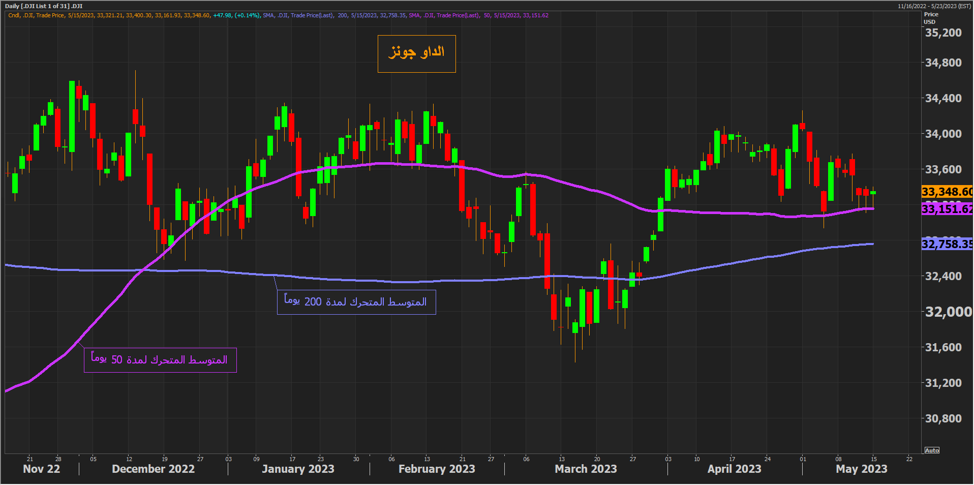 ارتفع مؤشر الداو جونز بنحو 0.14% ما يعادل 48 نقطة بعد 5 جلسات متتالية من الانخفاض وسط ارتفاع سهمي American Express وBoeing بأكثر من 2% لكل منهما مقابل انخفاض Walmart وJohnson & Johnson بأكثر من 1% لكل منهما.