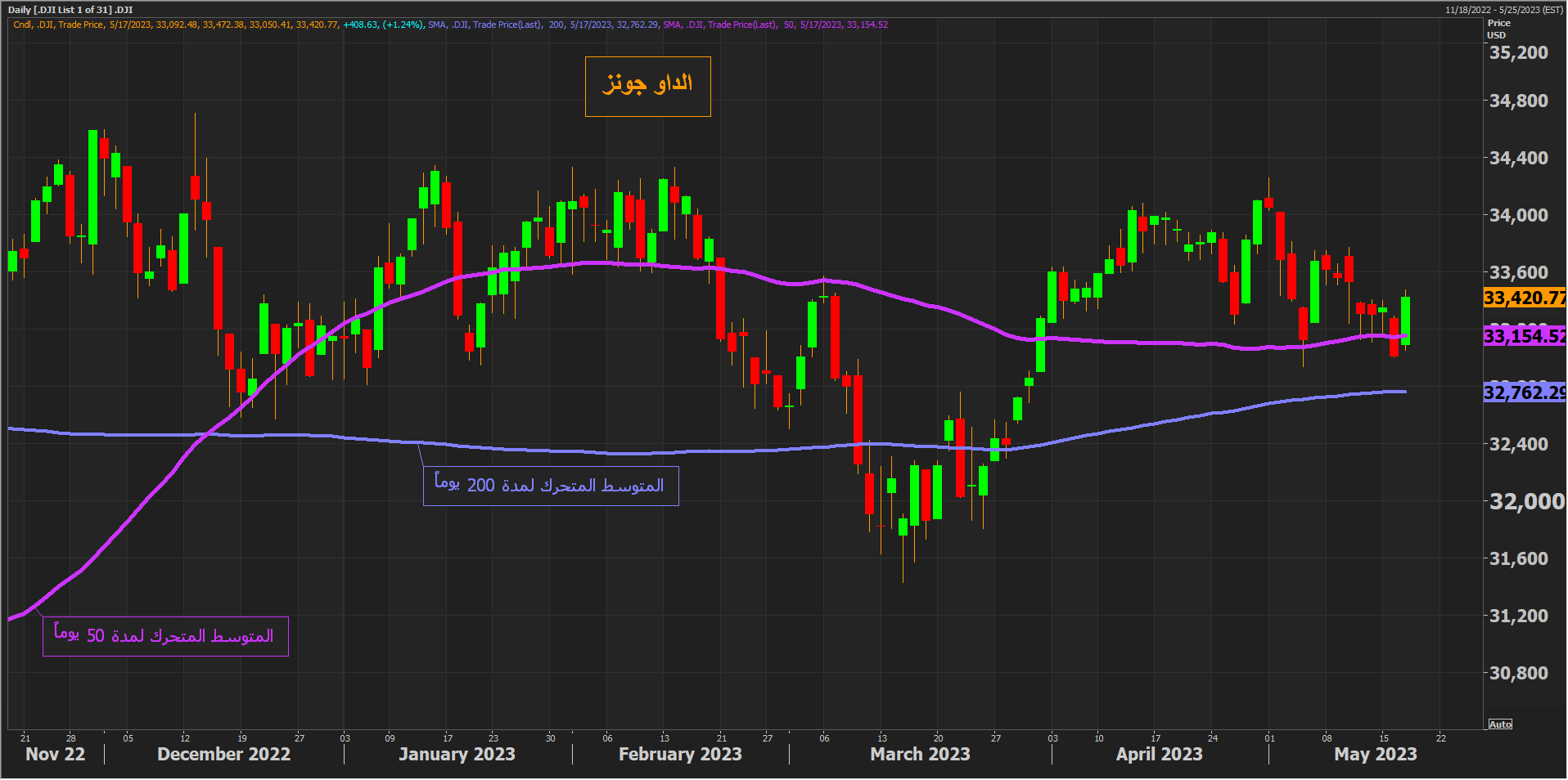 ارتفع مؤشر الداو جونز بنحو 1.24% أي ما يعادل أكثر من 400 نقطة ليغلق فوق مستويات المتوسط المتحرك لمدة 50 يوماً.