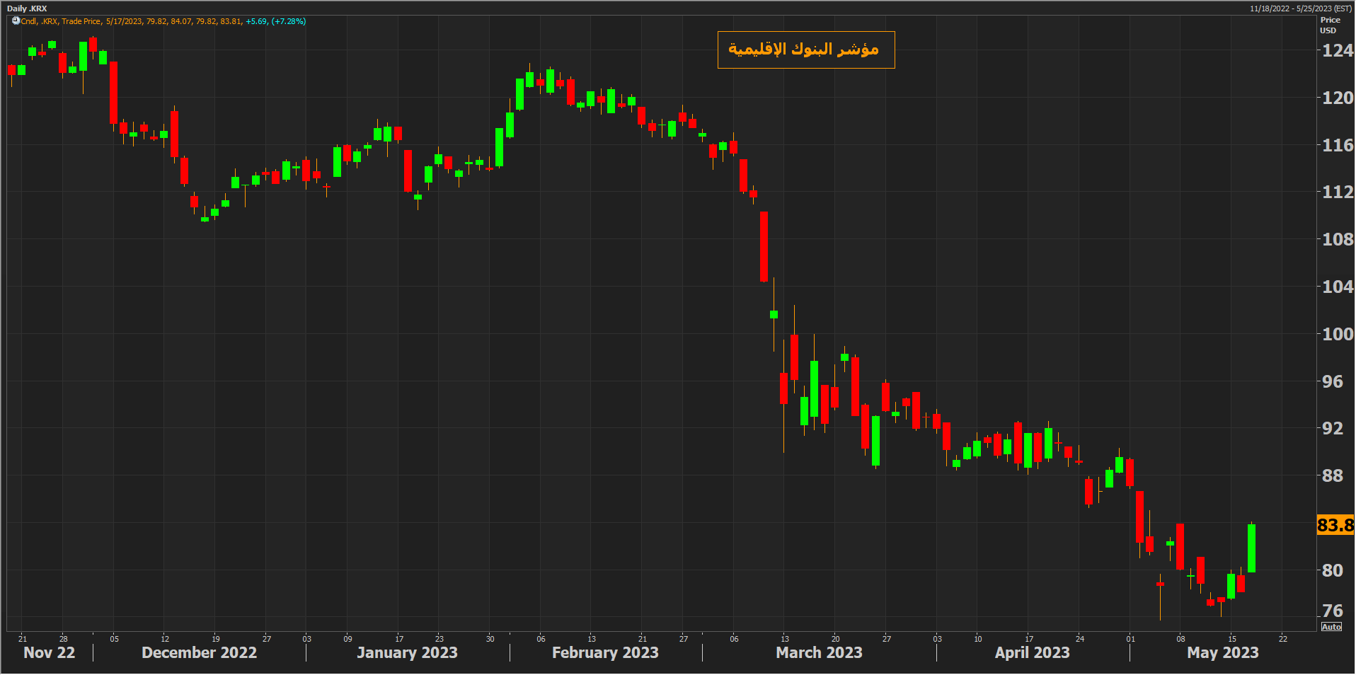 ارتفع مؤشر البنوك الإقليمية بأكثر من 7% محققاً أعلى مكاسب يومية له منذ أكثر من عامين مما يشير إلى انحسار المخاوف بشأن تصاعد متاعب القطاع المصرفي.