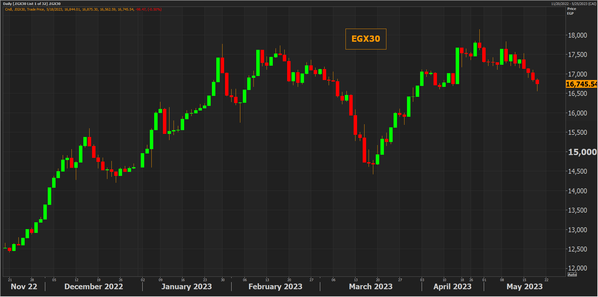 وانخفض المؤشر الثلاثيني بنسبة 0.5% أي ما يعادل نحو 98 نقطة مسجلاً رابع انخفاض يومي على التوالي بضغط من هبوط القيادي سهم البنك التجاري الدولي بنحو 2.7%.