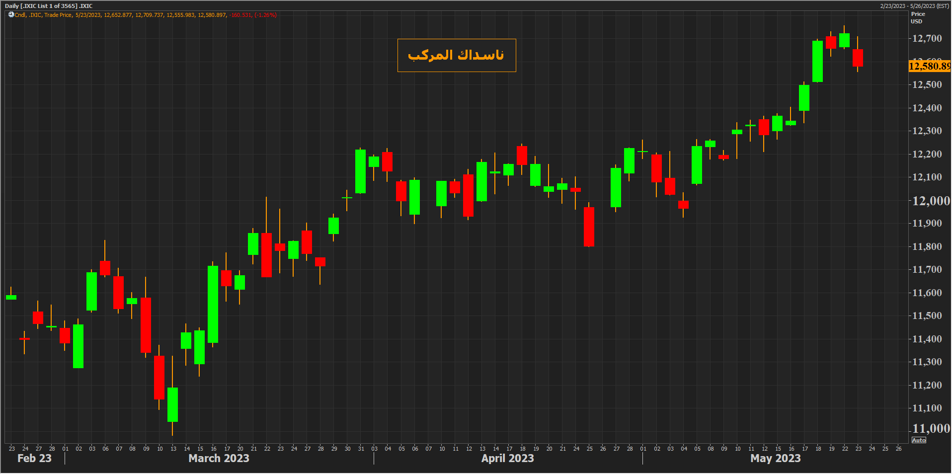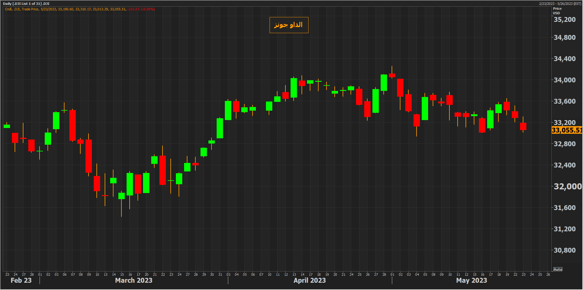 وانخفض مؤشر الداو جونز بنحو 0.7% أي ما يعادل 230 نقطة منخفضاً للجلسة الثالثة على التوالي ليغلق دون مستويات 33100 نقطة وبالقرب من أدنى مستوياته في قرابة شهرين.