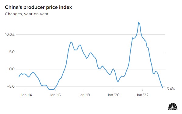 أظهرت بيانات رسمية أن أسعار المنتجين السنوية في الصين انخفضت للشهر التاسع على التوالي في يونيو، إذ انخفضت أسعار المنتجين بنسبة 5.4% في يونيو مقارنة بالعام السابق وانخفضت بنسبة 0.% عن الشهر الماضي، وفقًا لمكتب الإحصاء الوطني الصيني.