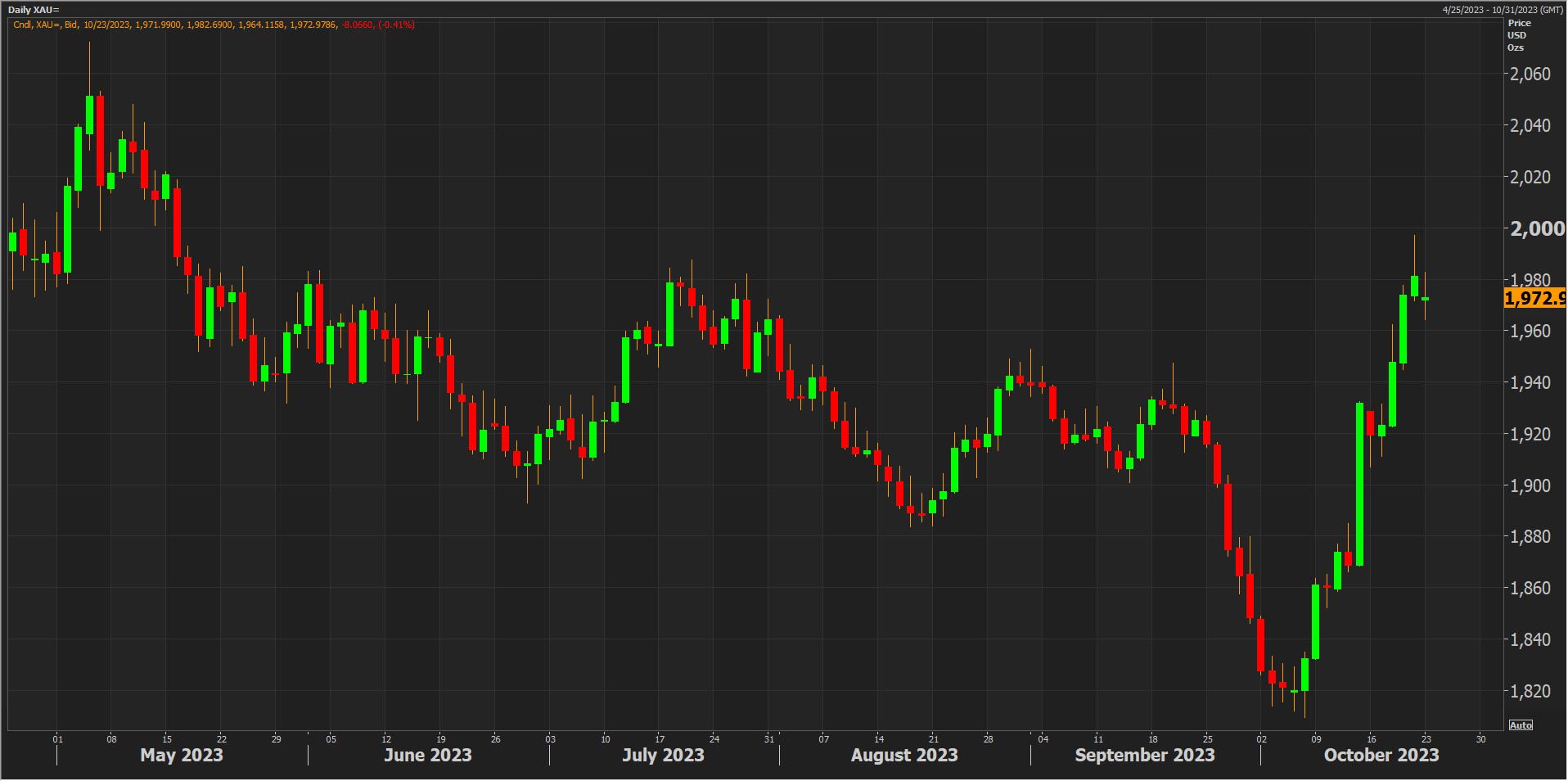 وارتفع الذهب نحو 9% في الأسبوعين الماضيين مع سعي المستثمرين للتحوط من مخاطر تصعيد أوسع نطاقا بسبب الحرب في غزة.