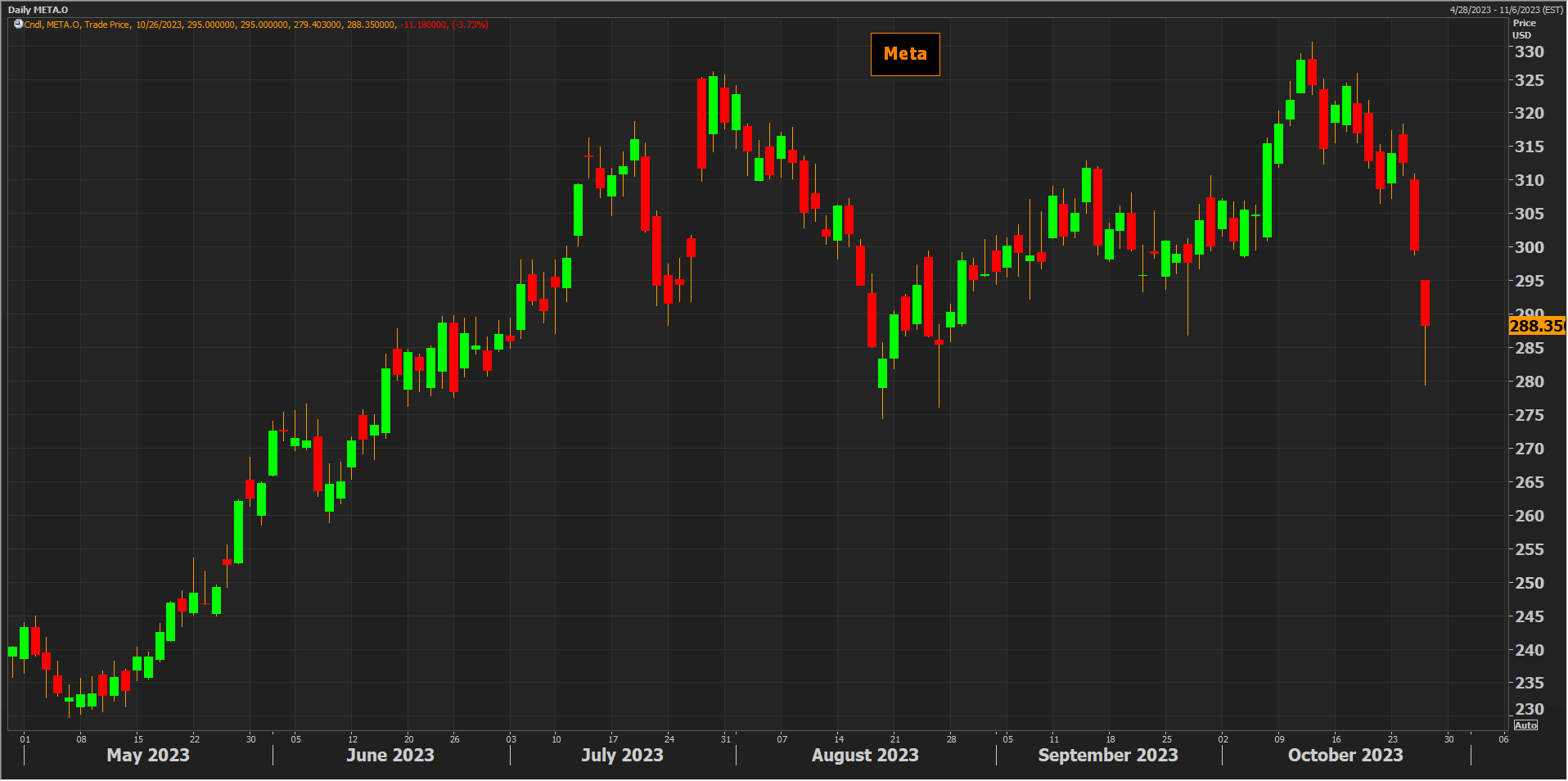 هبط سهم Meta بنحو 3.7% في جلسة الخميس مسجلاً أدنى إغلاق يومي له في شهرين لتفقد الشركة نحو 29 مليار دولار من قيمتها السوقية في يوم واحد.