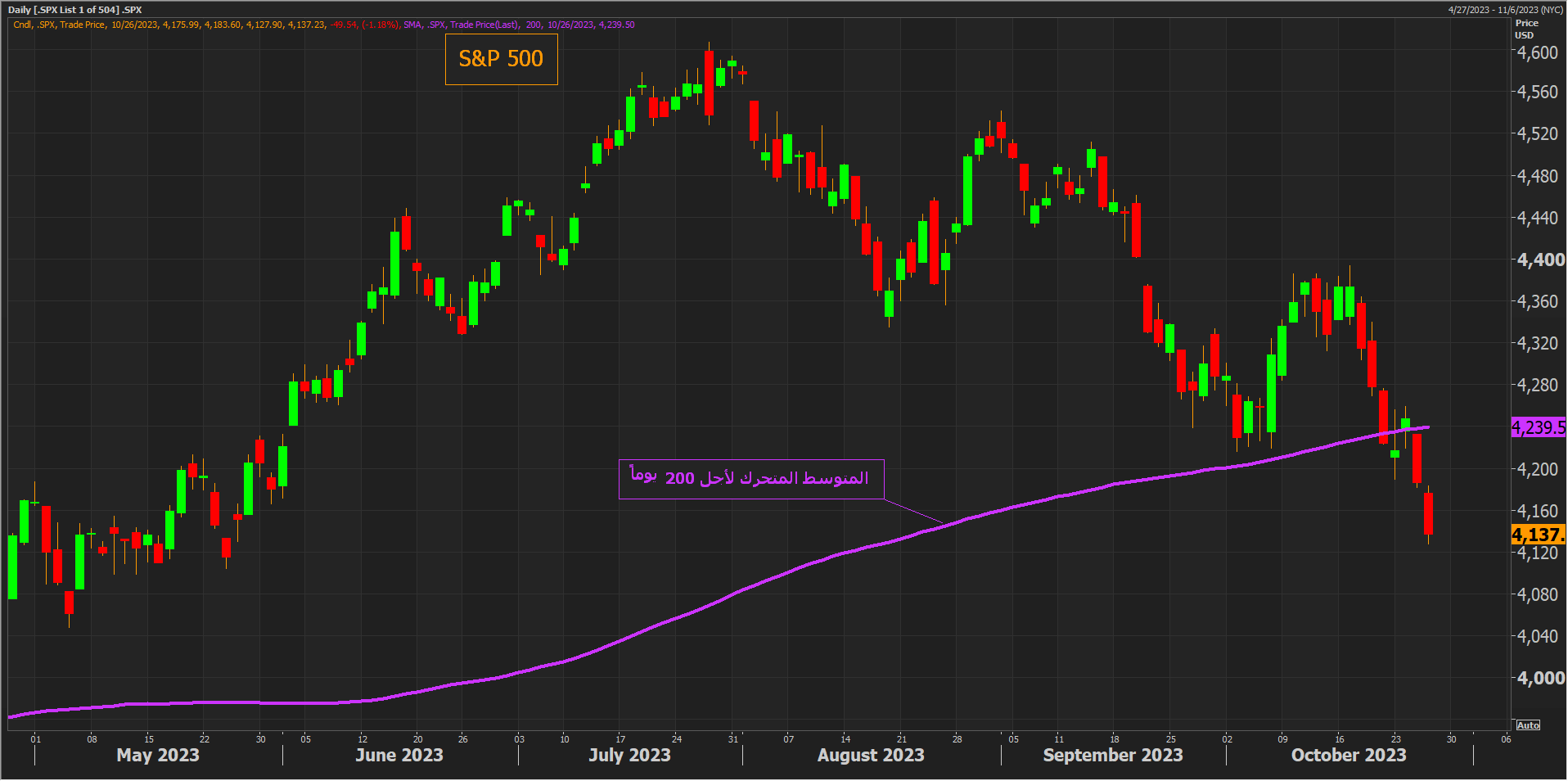 وانخفض مؤشر S&P 500 بنحو 1.8% مسجلاً أدنى إغلاق في 5 أشهر ليبتعد عن المتوسط المتحرك لأجل 200 يوماً والبالغ 4240 نقطة.