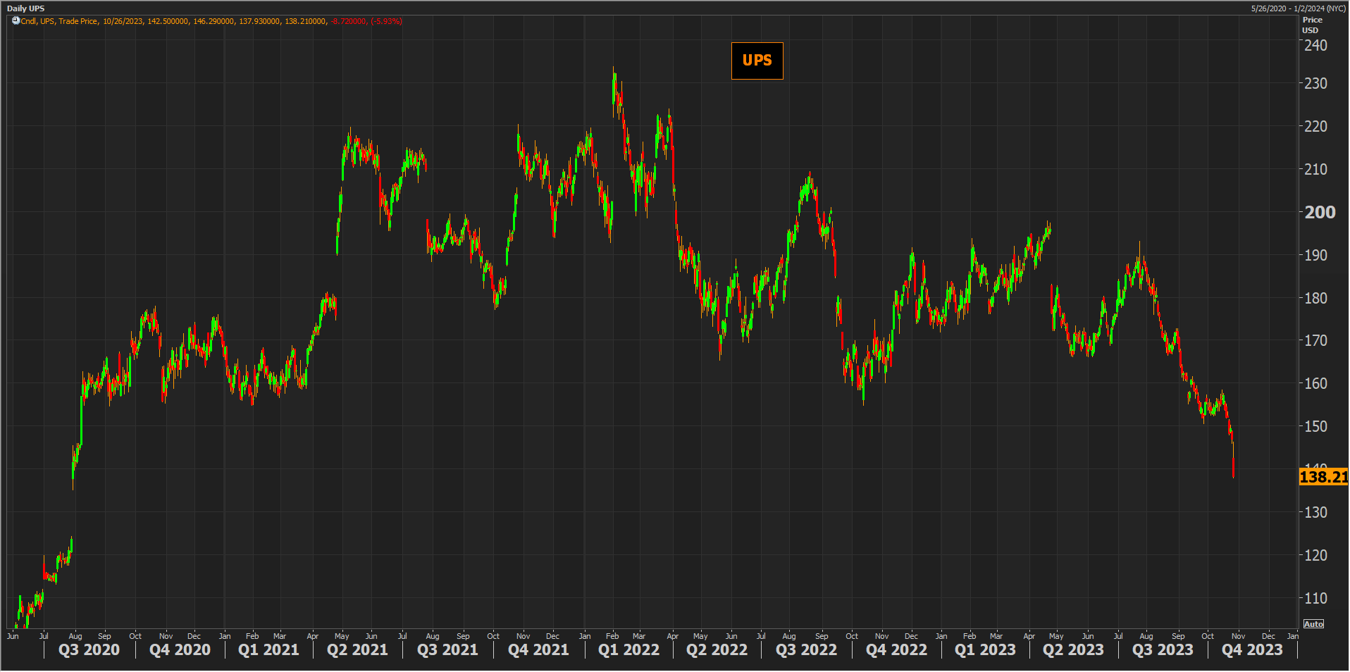 تراجع سهمUPS  بنحو 6% في جلسة الخميس ليهوي إلى أدنى مستوياته في أكثر من 3 سنوات بعد أن خفضت الشركة توقعات إيراداتها لعام 2023.