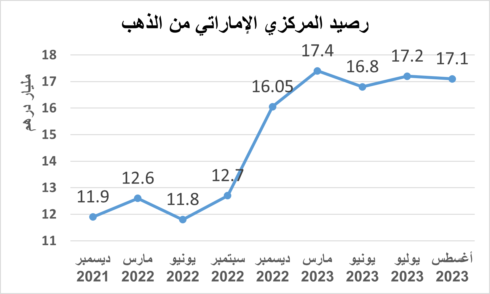 أظهرت البيانات الصادرة من مصرف الإمارات المركزي ارتفاع رصيده من الذهب بنحو 53% على أساس سنوي أي ما يعادل 5.9 مليار درهم ليصل إلى 17.1 مليار درهم في شهر أغسطس من العام الحالي .