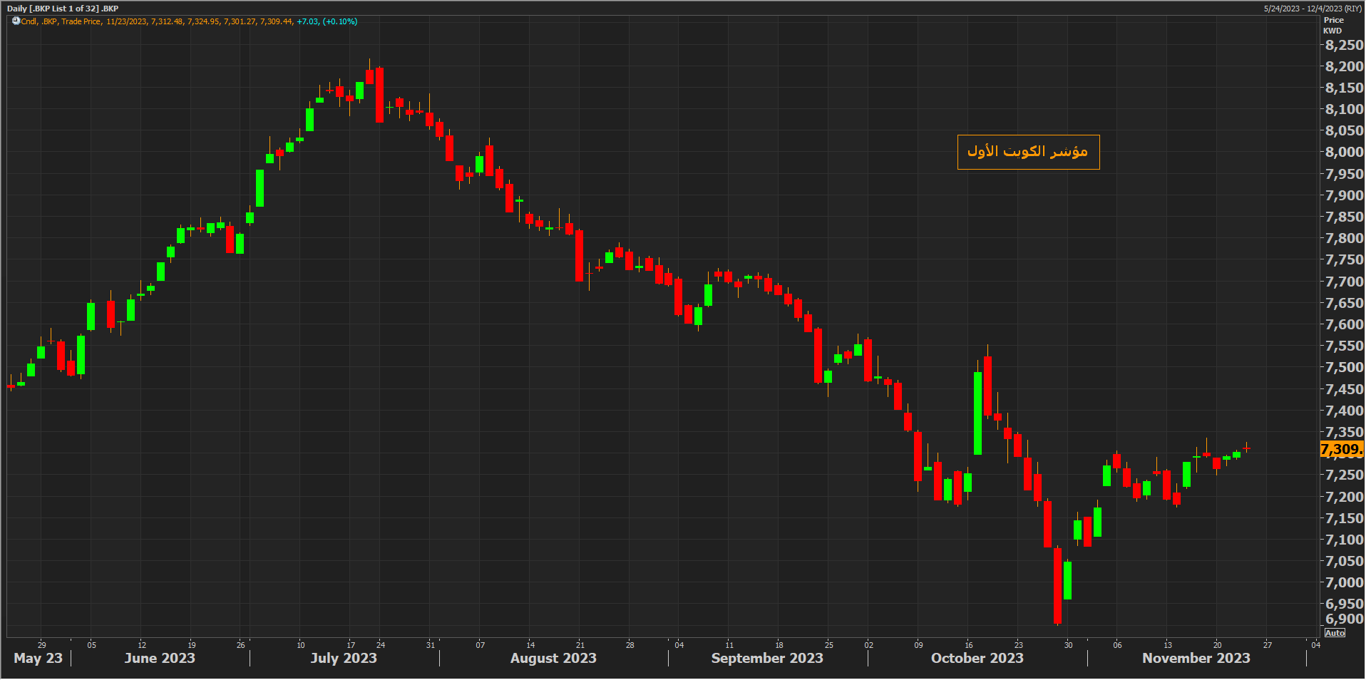 بينما ارتفع مؤشر الكويت الأول بنسبة 0.1% بدعم من ارتفاع سهمي أرزان وعقارات الكويت بنسبة 4.2% و2.3% على التوالي.