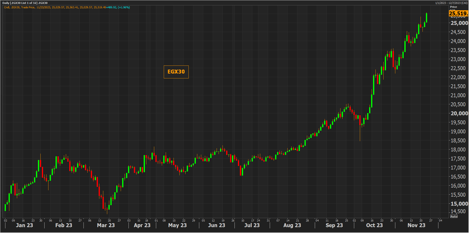 وارتفع المؤشر الثلاثيني بنحو 2% أي ما يعادل 490 نقطة ليغلق فوق مستويات 25500 نقطة لأول مرة في تاريخه بعد أن قفز سهم التجاري الدولي بأكثر من 5% لأعلى مستوياته على الإطلاق.