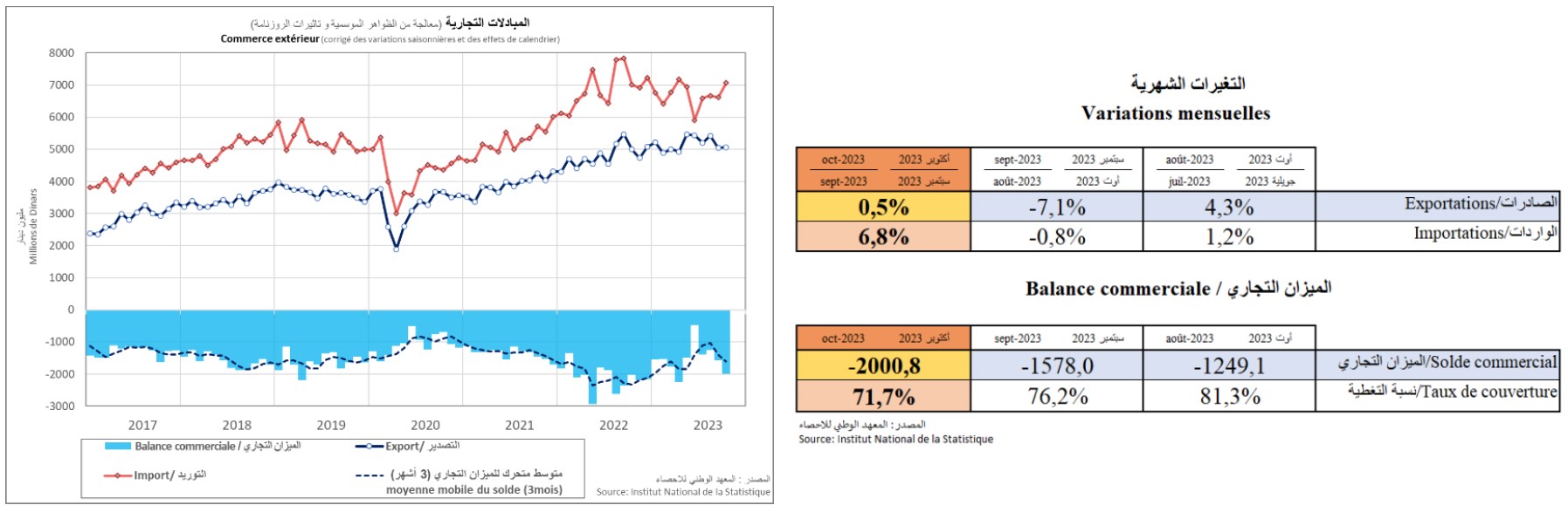 سجل عجز الميزان التجاري في تونس، ارتفاعاً بنسبة 26.8% في شهر أكتوبر (تشرين الأول) الماضي، على أساس شهري، وفق أحدث البيانات الصادرة عن المعهد الوطني للإحصاء.