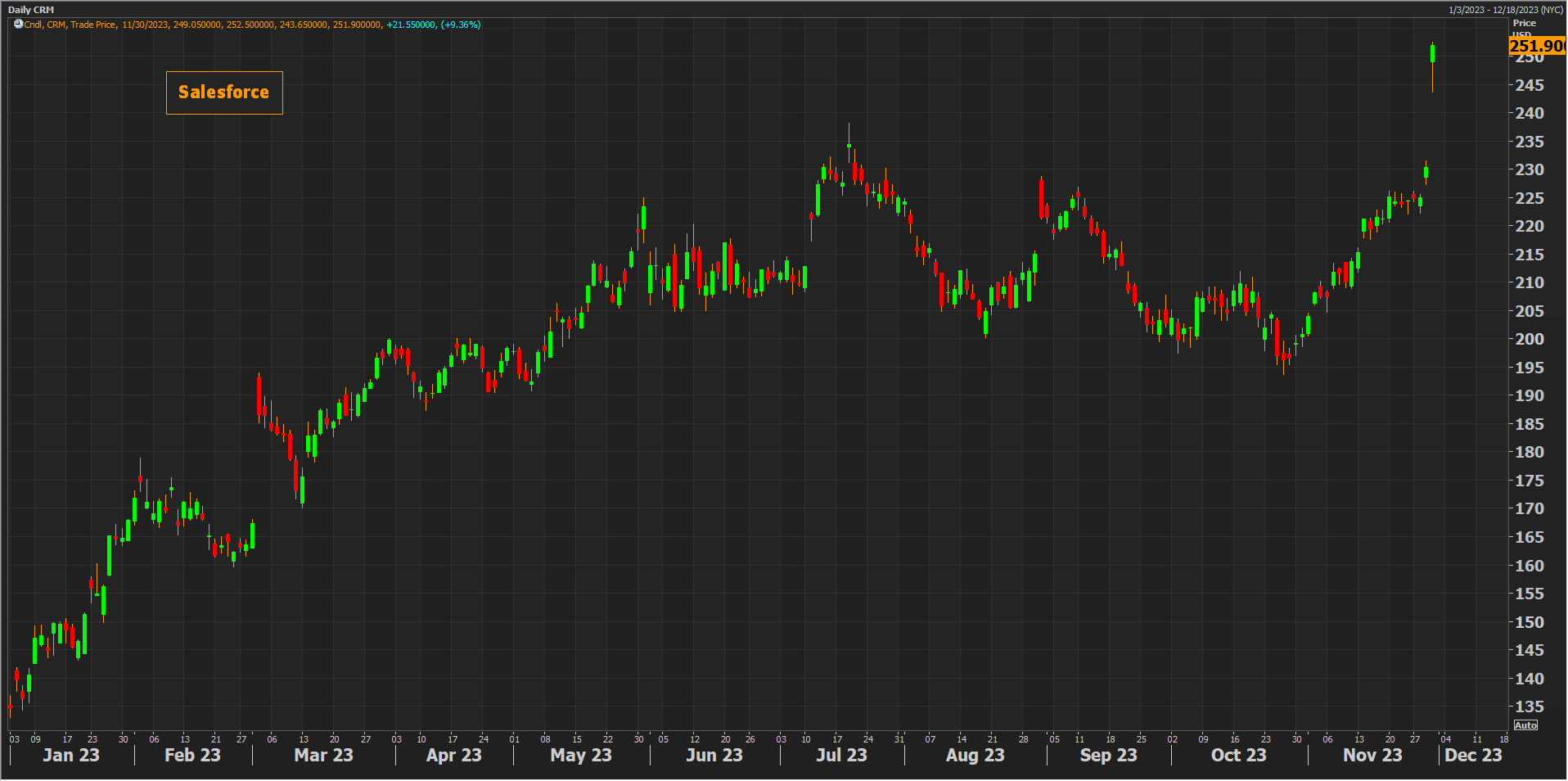 قفز مؤشر الداو جونز بنحو 1.5% أي ما يعادل 520 نقطة في جلسة الخميس ليغلق عند أعلى مستوياته منذ يناير 2022 بدعم من المكاسب القوية لسهم Salesforce.