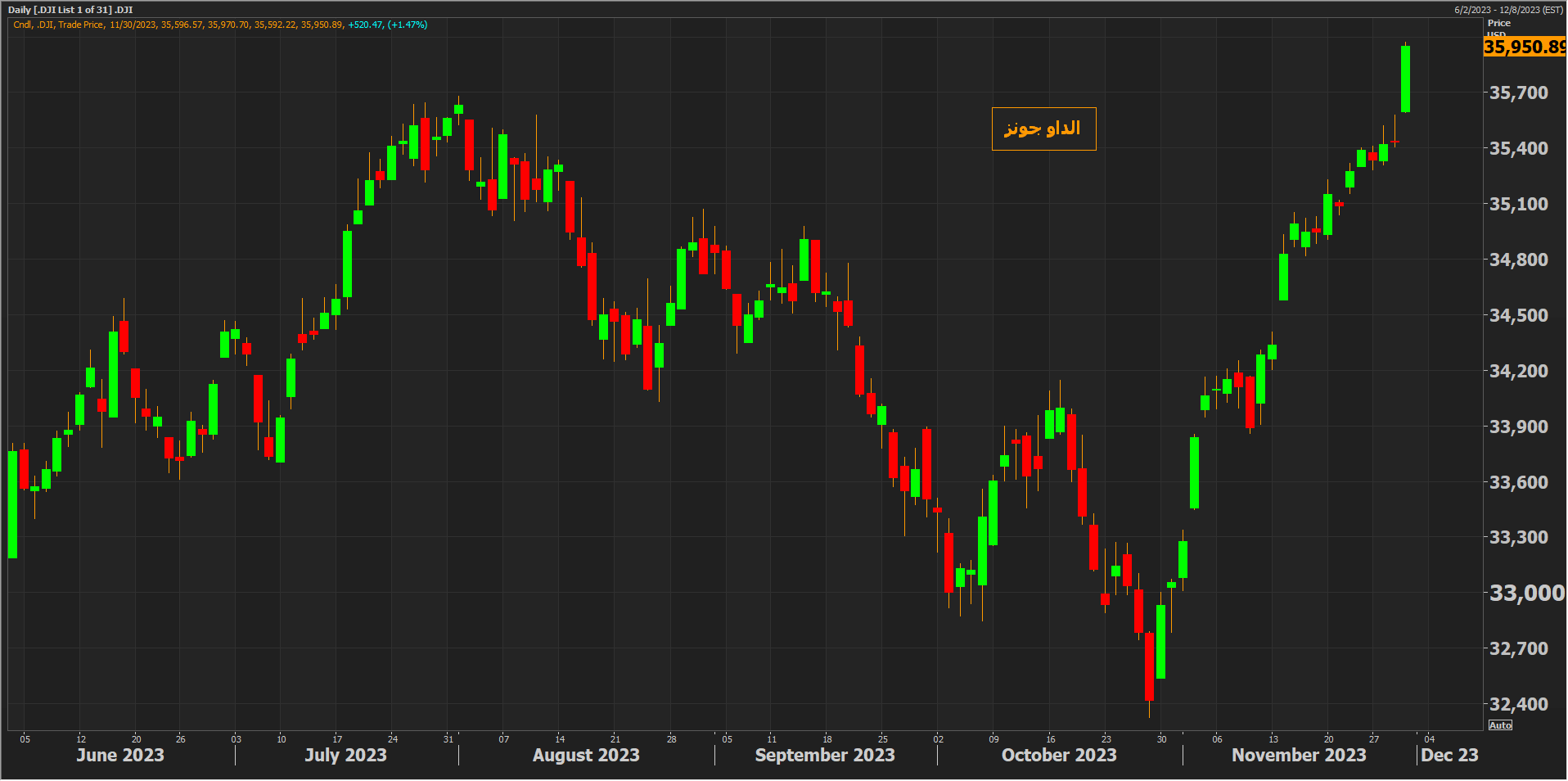 وعلى مدار الشهر، ارتفع الداو جونز بنحو 9% في نوفمبر محققاً أعلى مكاسب شهرية منذ أكتوبر 2022.