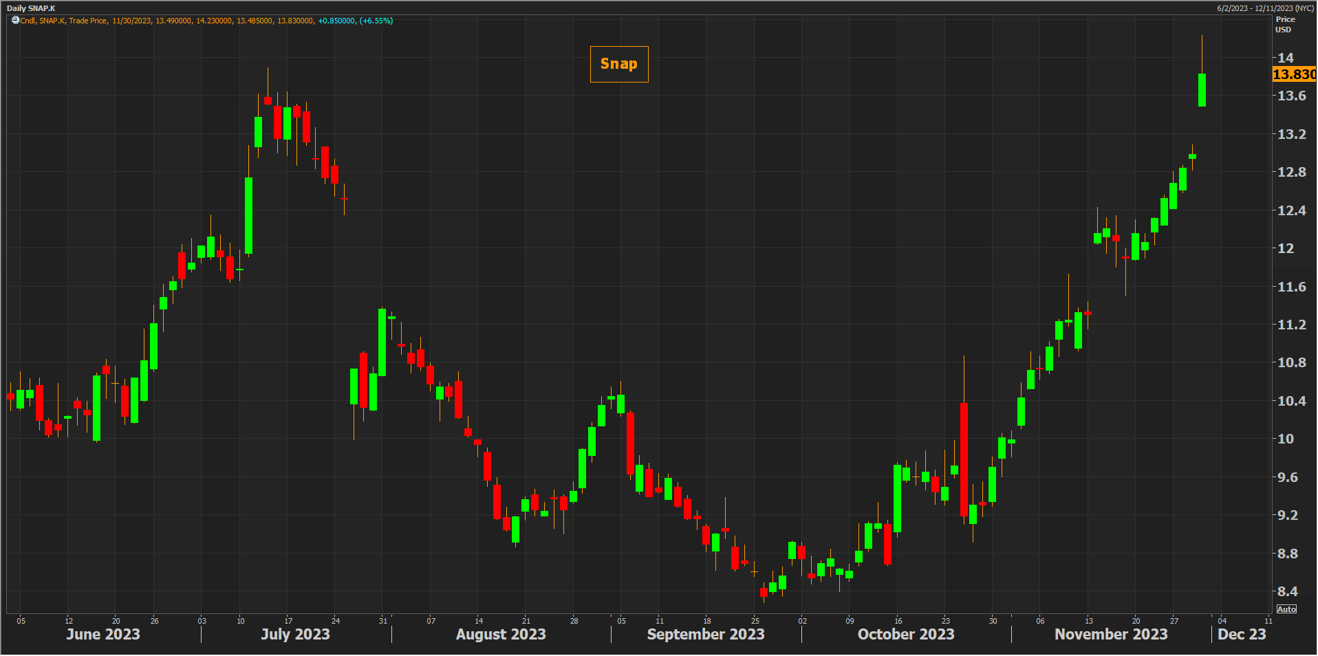 ارتفع سهم Snap بأكثر من 6% في جلسة الخميس مسجلاً أعلى إغلاق له في 16 شهراً، كما قفز السهم بنسبة 38% في نوفمبر محققاً أعلى مكاسب شهرية في 3 سنوات