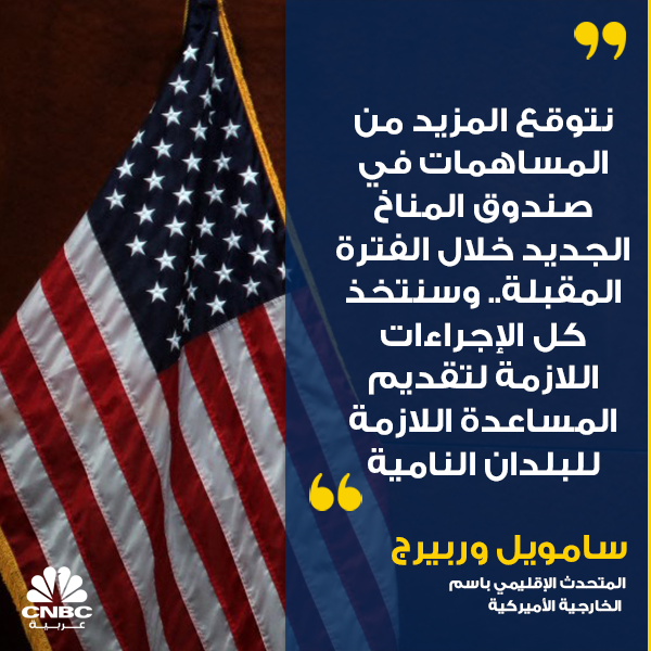 وأشار وربيرج هنا إلى مساهمة بلاده بمبلغ 17 مليون دولار في الصندوق الهادف لتقديم الدعم للبلدان المتضررة من تداعيات التغير المناخي، مردفاً: "هذه هي المساهمة الأميركية الأولى.. وأقول الأولى لأنه نتوقع في الأيام والأسابيع والسنوات المقبلة بأننا سنرى مساهمات أميركية أكثر من مبلغ الـ 17 مليون دولار.. نتوقع أن نسمع أكثر من هذه التفاصيل في المرحلة المقبلة".