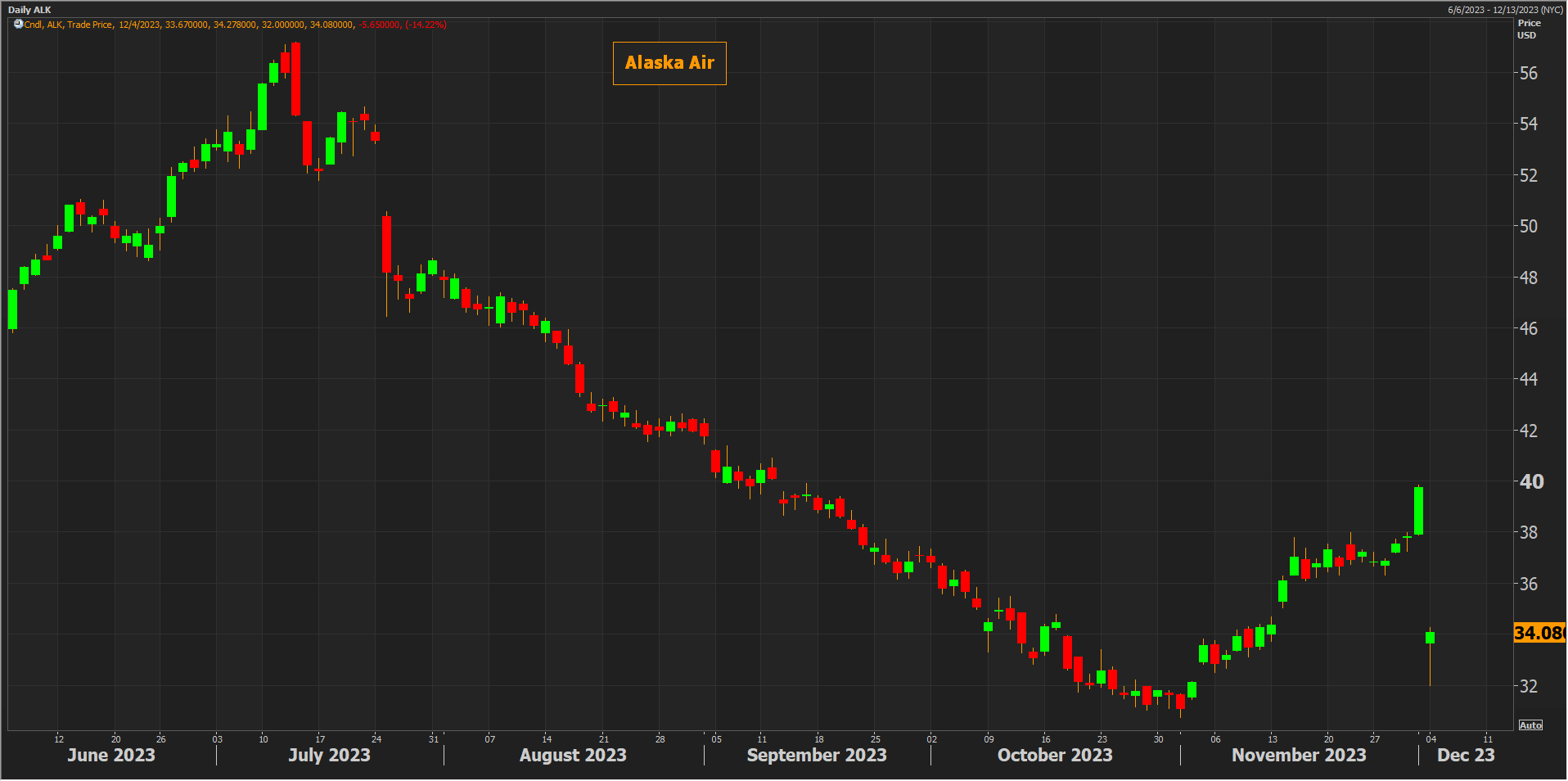 هبط سهم Alaska Air بأكثر من 14% في جلسة الإثنين ليهوي بأكبر وتيرة يومية منذ مارس 2020 أي منذ بدء جائحة كورونا.