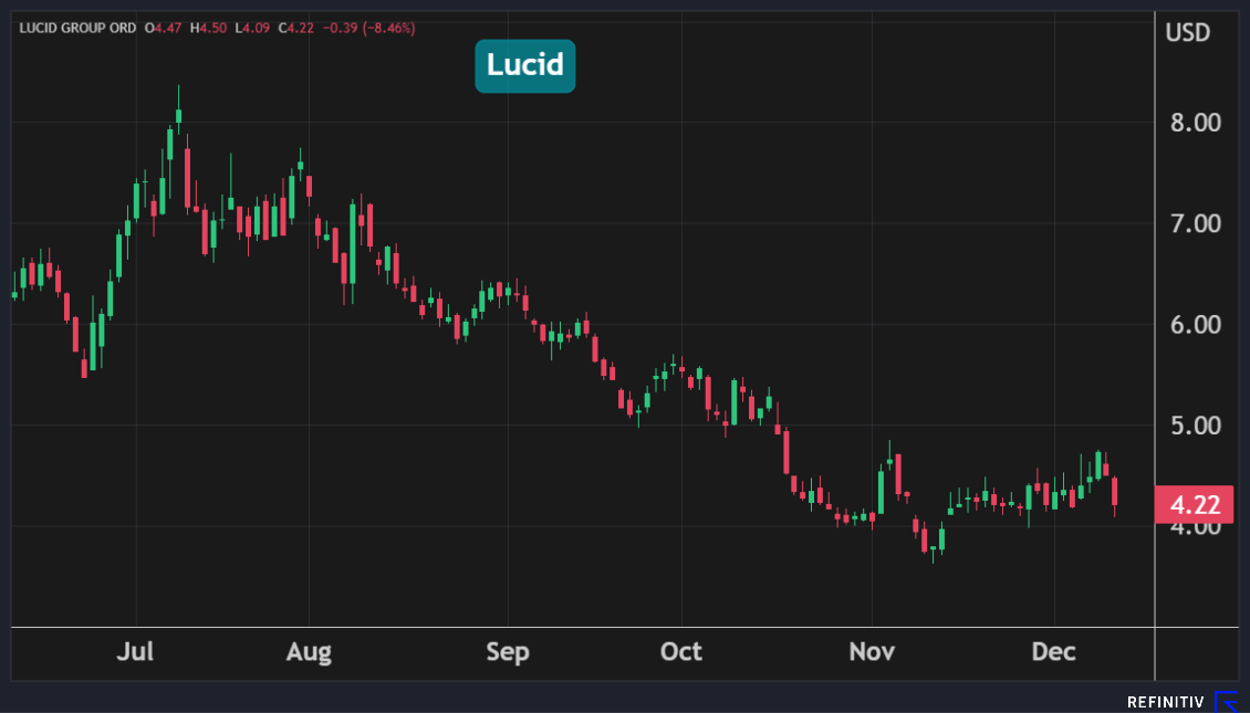 هبط سهم Lucid بأكثر من 8% في جلسة الثلاثاء مسجلاً أكبر خسارة يومية في نحو شهرين، ليخسر السهم أكثر من 90% من قيمته منذ ذروته القياسية في فبراير 2021 .