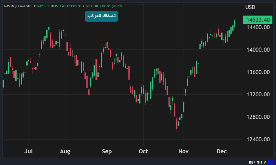 وارتفع مؤشر ناسداك المركب بنسبة 0.7% أي ما يعادل نحو 100 نقطة ليغلق فوق 14500 نقطة للمرة الأولى له منذ مارس 2022 .