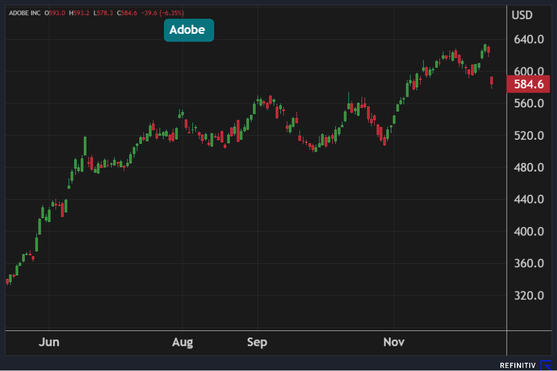 تراجع سهم Adobe بأكثر من 6% مسجلاً أكبر خسارة يومية في 10 أشهر، لتفقد الشركة 18 مليار دولار من قيمتها السوقية في يوم واحد .