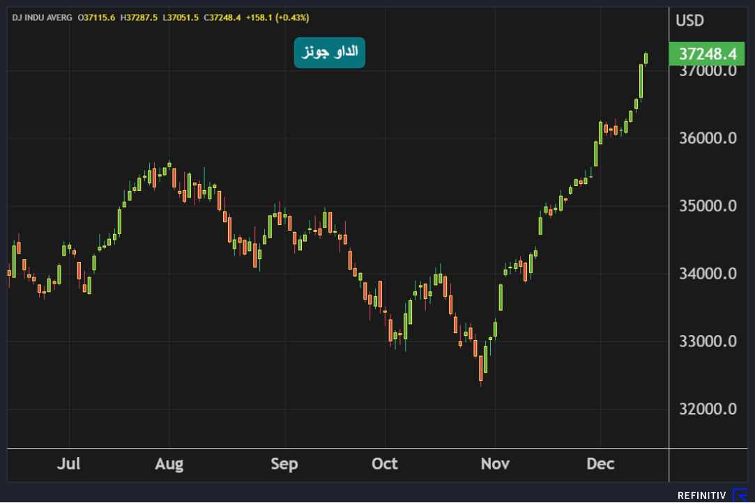 ارتفع مؤشر الداو جونز بنسبة 0.4% أي ما يعادل أكثر من 158 نقطة في جلسة الخميس ليغلق فوق 37200 نقطة للمرة الأولى في تاريخه.