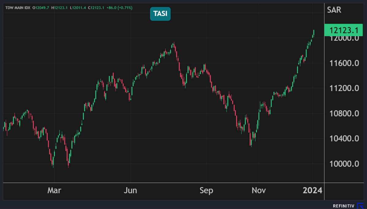 وكان المؤشر السعودي قد أنهى العام الماضي على مكاسب بنحو 14% مسجلاً أعلى إغلاق سنوي له في 18 عاماً.