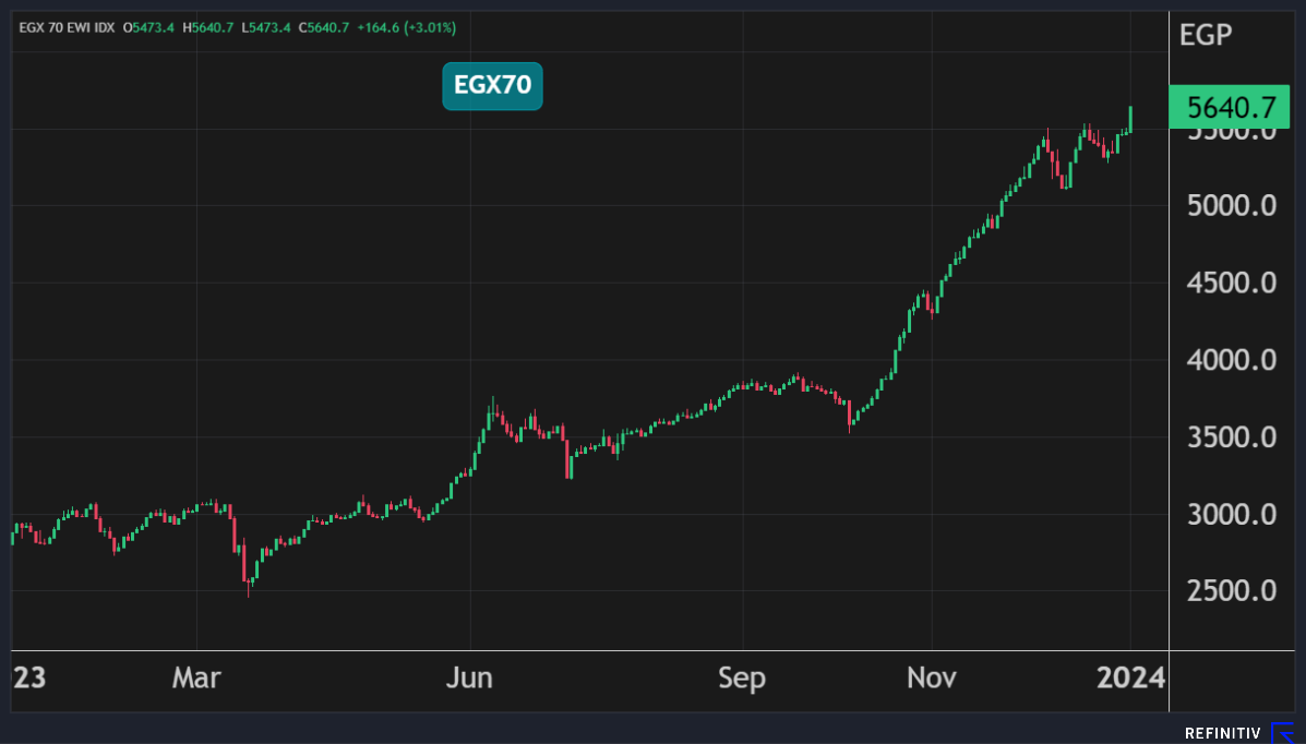 وارتفع المؤشر الثلاثيني بنسبة 2.7% أي ما يعادل 669 نقطة مسجلاً رابع مكاسب يومية على التوالي بدعم من ارتفاع سهم البنك التجاري الدولي بنسبة 3%.