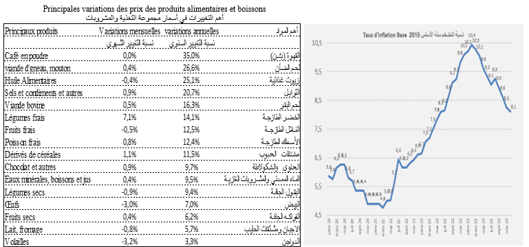 شهدت أسعار المواد الحرة ارتفاعا بنسبة 9,4% مقابل 3,9% بالنسبة للمواد المؤطرة، مع العلم أن نسبة الانزلاق السنوي للمواد الغذائية الحرة بلغت 13,8% مقابل 3,3% بالنسبة للمواد الغذائية المؤطرة.