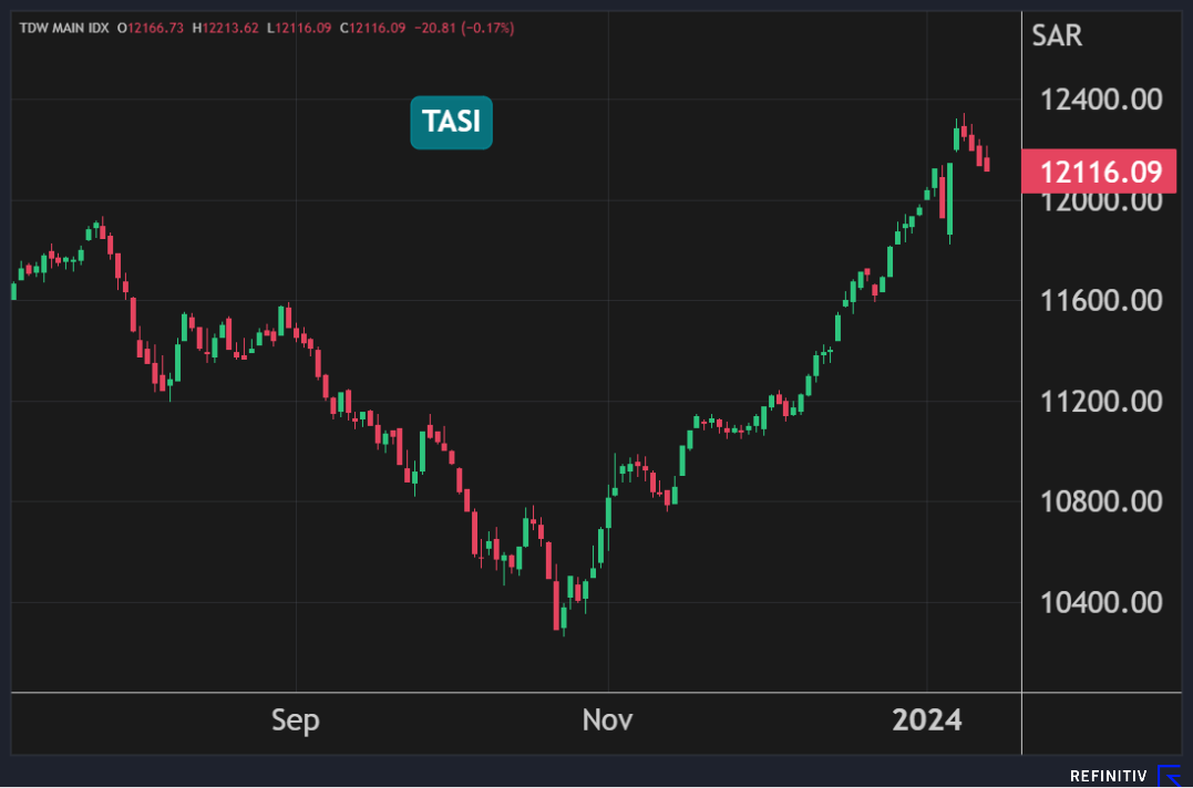 وعلى مدار الأسبوع، تراجع المؤشر السعودي بنسبة 0.2% في الأسبوع الثاني من عام 2024 مسجلاً أول خسارة أسبوعية منذ 23 من نوفمبر الماضي.