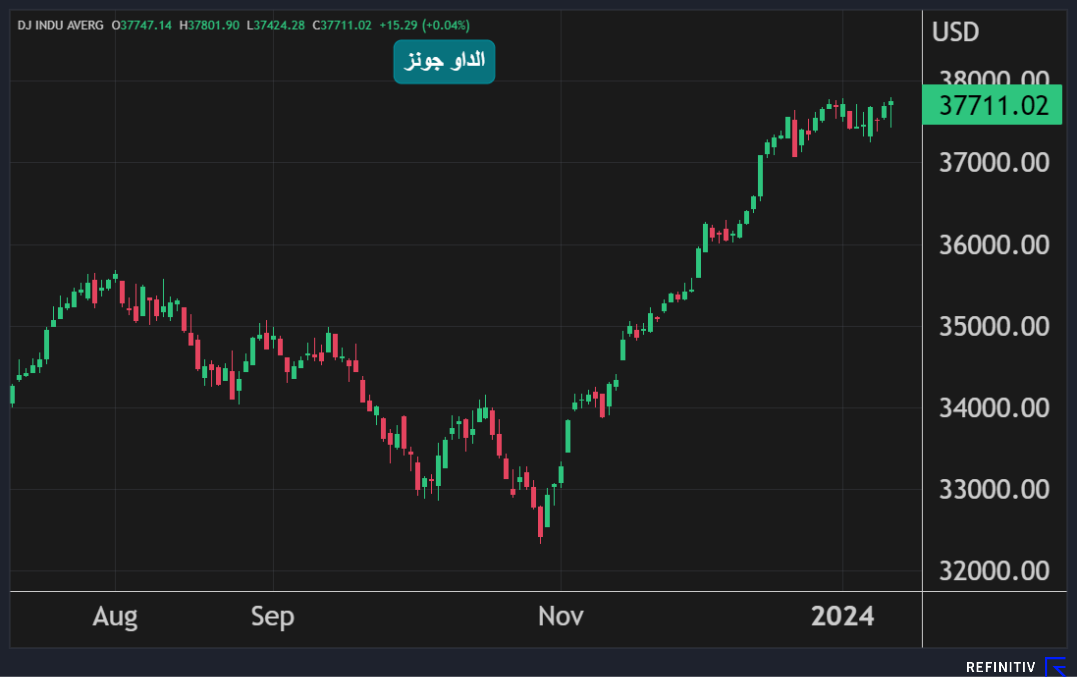 ارتفع مؤشر الداو جونز بنسبة طفيفة بلغت 0.04% أي ما يعادل 15 نقطة في جلسة الخميس ليغلق بالقرب من أعلى مستوياته على الإطلاق