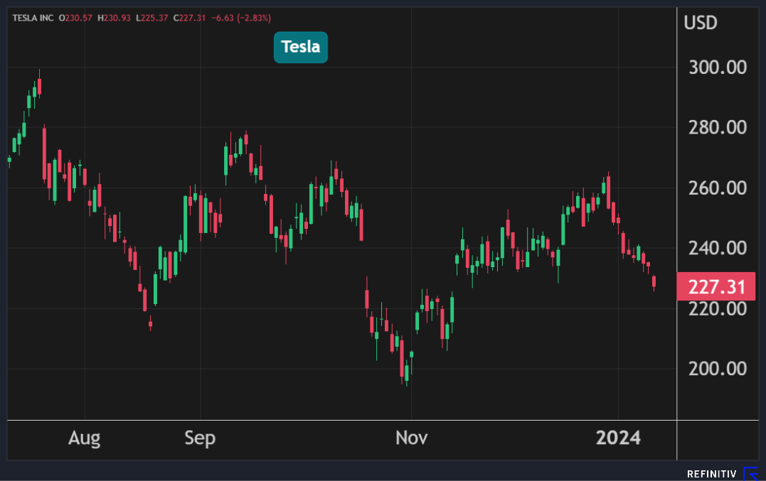وعمق السهم من خسائره بالساعة الأخيرة من الجلسة بعد أن أعلنت الشركة أنها ستعلق معظم إنتاج السيارات في مصنع لها بالقرب من برلين في الفترة من 29 يناير إلى 11 فبراير، مشيرة إلى نقص المكونات بسبب التحولات في مسارات الشحن على خلفية الصراع المسلح في البحر الأحمر.