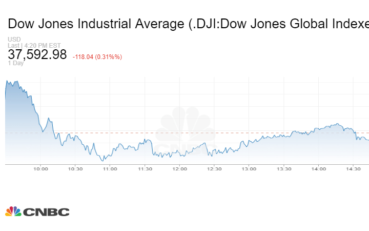 وخسر مؤشر Dow Jonesأكثر من 100 نقطة، متراجعاً بنحو 0.31%، لينهي تعاملات الأسبوع عنج مستوى 37.592 ألف نقطة.