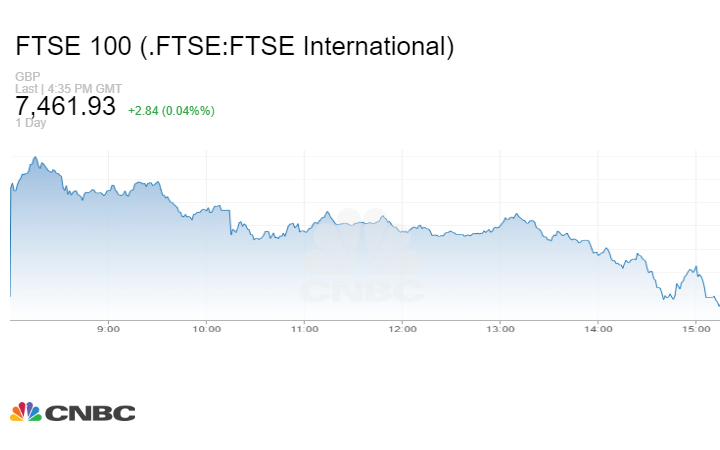 واستقر مؤشر FTSE البريطاني، عند مستوى 7,461.93 نقطة، بعد أن سجل ارتفاعاً طفيفاً بنسبة 0.04% خلال تعاملات جلسة نهاية الأسبوع.