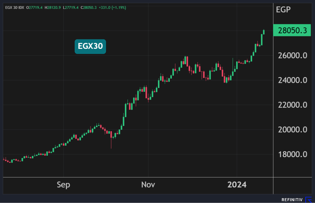وارتفع المؤشر الثلاثيني بنسبة 1.2% متجاوزاً مستويات 28000 نقطة لأول مرة في تاريخه بدعم من ارتفاع سهمي البنك التجاري الدولي ومصر لإنتاج الأسمدة "موبكو" بنسبة 2.8% و10% على التوالي.