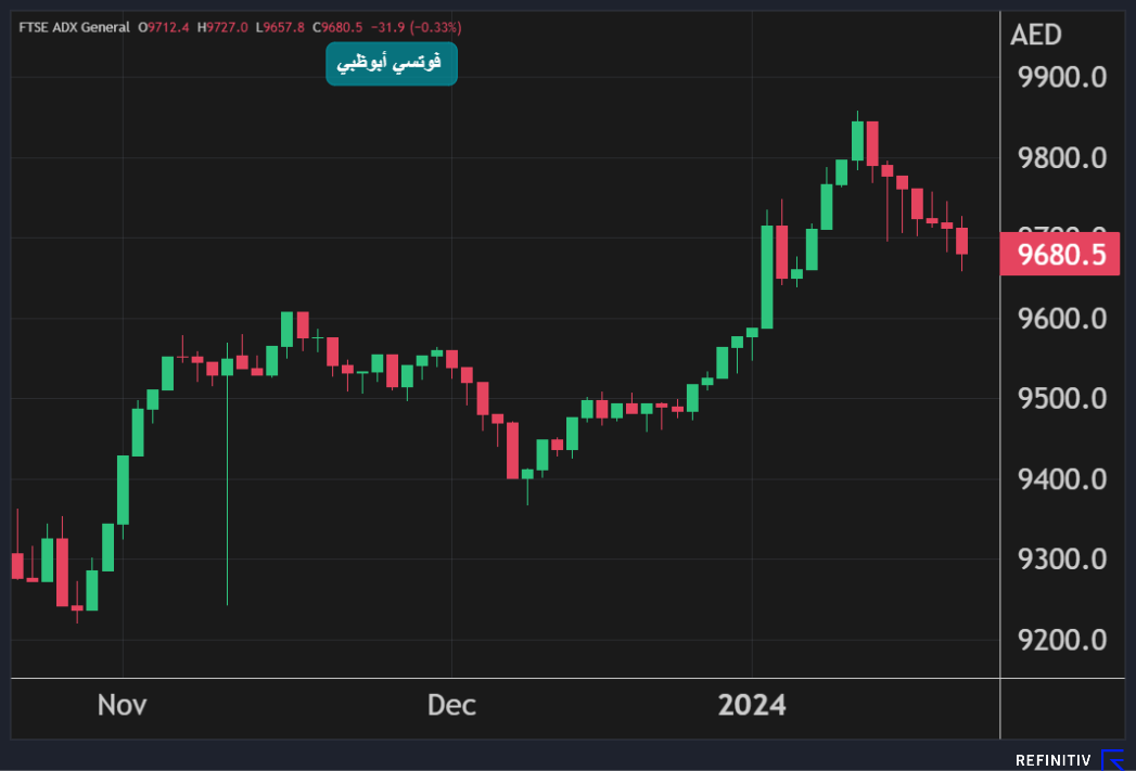 كما تراجع مؤشر فوتسي أبوظبي بنحو 0.3% مسجلاً سابع خسارة يومية على التوالي متأثراً بانخفاض سهمي أبوظبي الأول والعالمية القابضة بنسبة 0.4% و0.5% على التوالي.