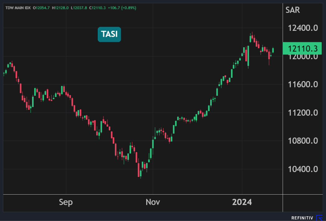 ارتفع مؤشر السوق الرئيسية بنحو 0.9% في جلسة الإثنين مسجلاً ثاني مكاسب يومية على التوالي ليستعيد مستويات 12100 نقطة ضمن سيولة بلغت 9.4 مليار ريال ومع ارتفاع 126 سهماً من أصل 232 شركة مدرجة.