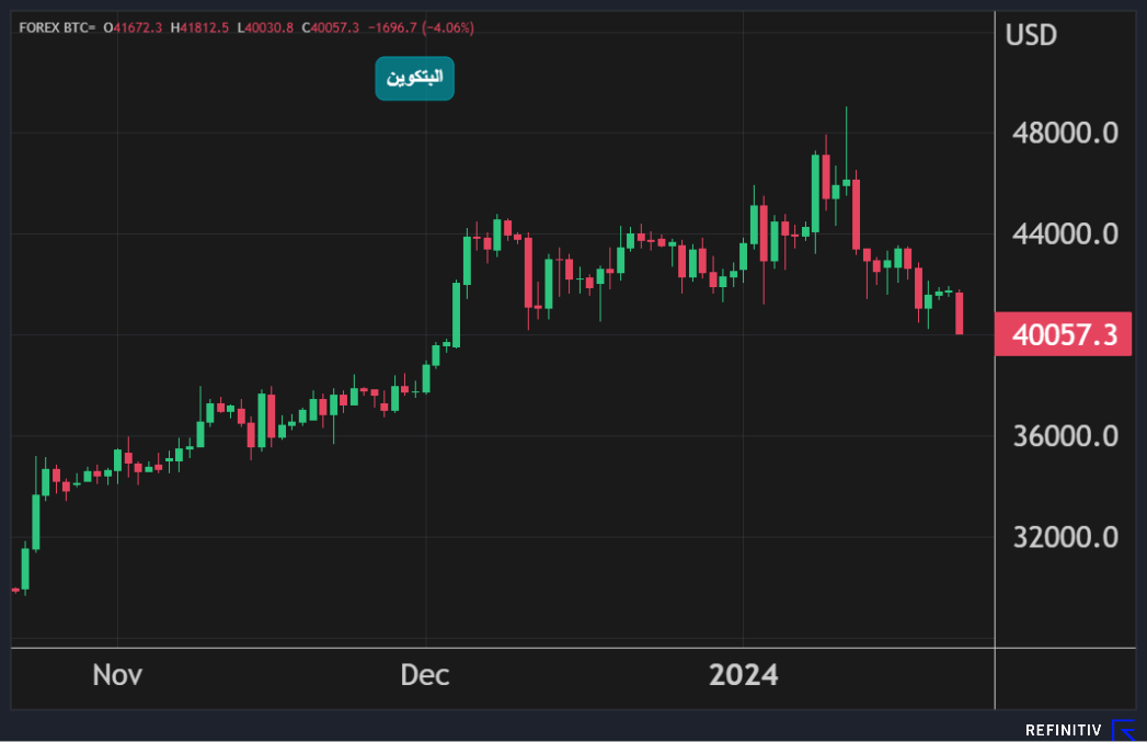 وانخفض سعر البيتكوين آخر مرة بنسبة 3.5% إلى 40237.64 دولاراً، وفقاً لـ Coin Metrics