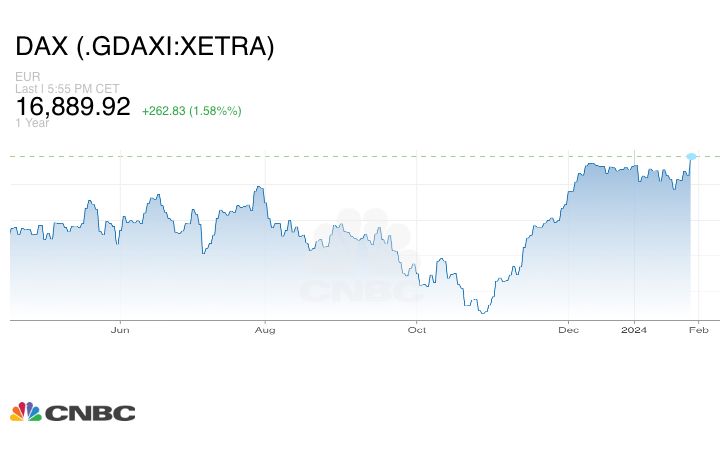 و شهد مؤشر DAX الألماني ارتفاعاً قارب 1.58% عند مستوى 16889 نقطة.