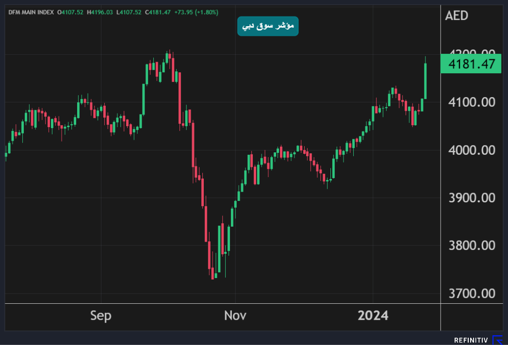 وأغلق سهم دبي الإسلامي عند أعلى مستوياته في 20 شهراً بعد أن رفع مجلس إدارة البنك التوزيعات النقدية إلى 45 فلساً عن عام 2023 مقارنة مع 30 فلساً عن عام 2022 بالتزامن مع إعلانه عن أرباحاً سنوية بأعلى من التوقعات.