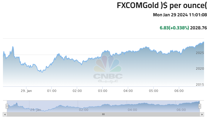 ارتفعت أسعار الذهب الاثنين 29 يناير إذ أدى تصاعد حدة التوتر في الشرق الأوسط إلى زيادة الطلب على المعدن النفيس باعتباره ملاذا آمنا وسط معاملات محدودة، حيث يترقب المستثمرون تصريحات رئيس الفدرالي الأميركي لاستيضاح الأمر بشأن معدلات الفائدة.