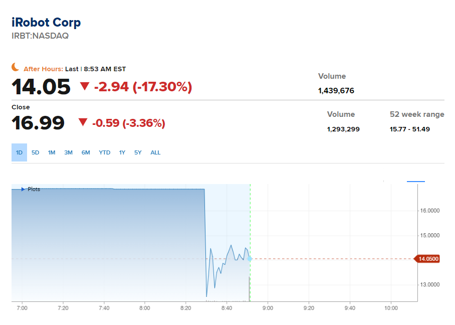 وانخفضت أسهم iRobot بنسبة 17% بسبب هذه الأخبار في تعاملات ما قبل الافتتاح.
