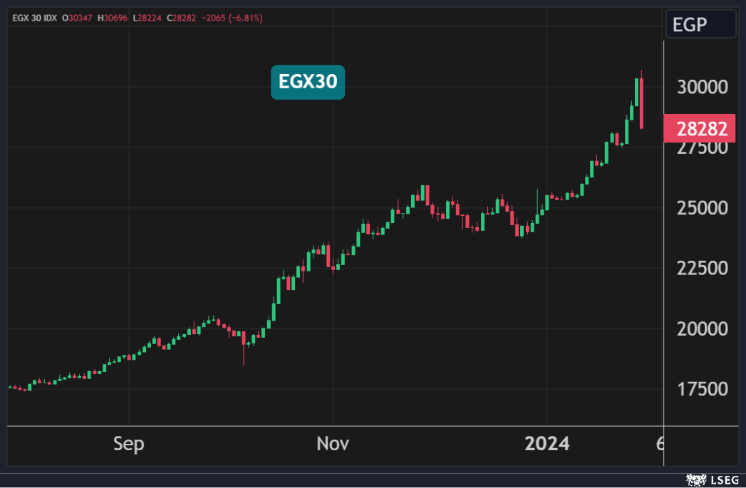 وانخفض المؤشر الثلاثيني بنسبة 6.8% ليهبط من أعلى مستوياته على الإطلاق بضغط من انخفاض جماعي للأسهم بقيادة سهمي طلعت مصطفى والشرقية للدخان بخسائر وصلت إلى 15% و11% على التوالي.