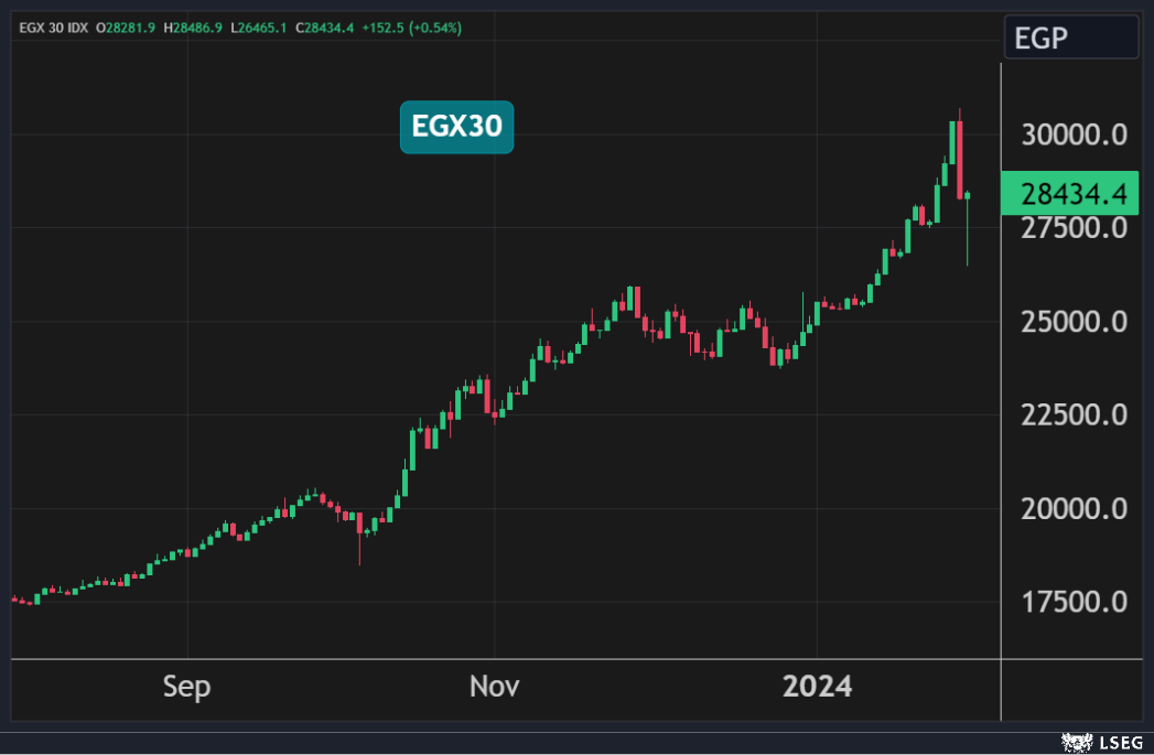 وارتفع المؤشر الثلاثيني بنسبة 0.5% ليستعيد مستويات 28400 نقطة بدعم من مكاسب سهمي طلعت مصطفى وحديد عز بنسبة 2.7% و5.6% على التوالي.