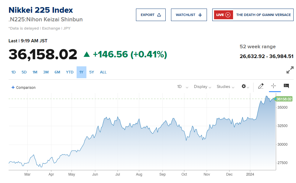 وفي نهاية الجلسة، ارتفع مؤشر نيكي بنحو 0.4% إلى 36158 نقطة، وبعدما صعد بأكثر من 1% خلال الجلسة، لكنه سجل مكاسب أسبوعية بنسبة 1.1%.