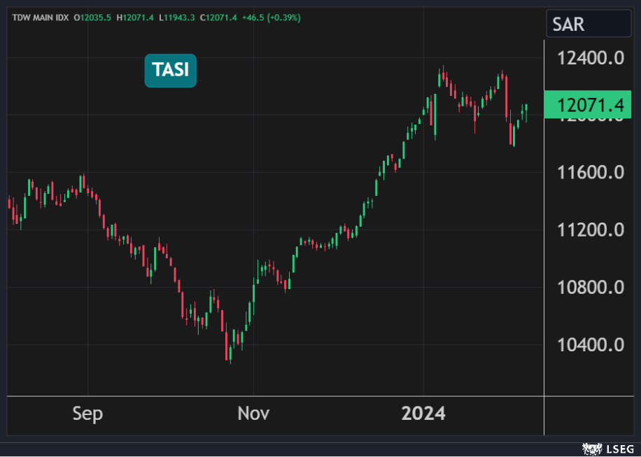 ارتفع مؤشر السوق الرئيسية بنسبة 0.4% في جلسة الثلاثاء مسجلاً رابع مكاسب يومية على التوالي ليغلق عند مستويات 12071 نقطة ضمن سيولة نشطة بلغت 9.4 مليار ريال ومع ارتفاع 135 سهماً من أصل 233 شركة مدرجة.
